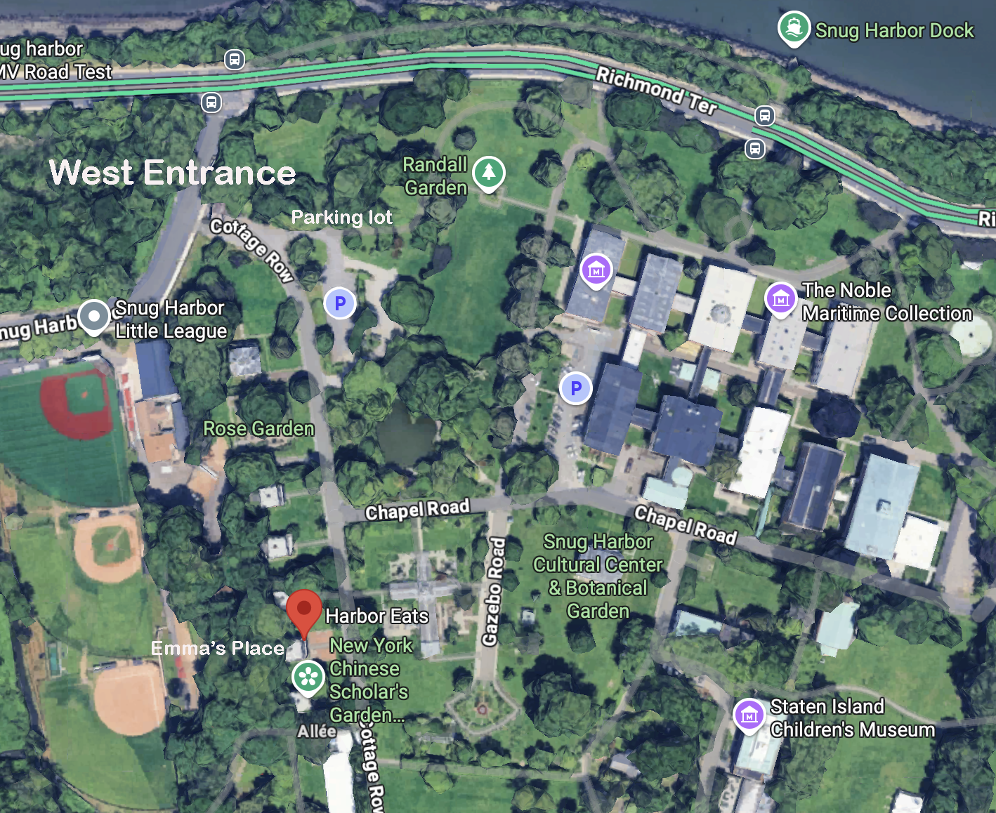 Enter the Snug Harbor grounds by the West entrance. Park in the nearby parking lot and walk along Cottage Row passing cottages on the right. Emma's place is the 2nd to last cottage.